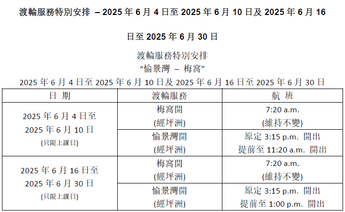 渡輪服務特別安排 - 2025年6月4-10日/16-30日